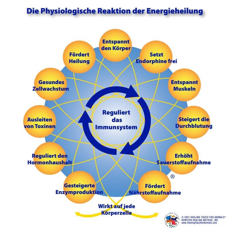 Das Verständnis, wie der Körper auf die Energietherapie reagiert, erklärt, wie Heilung mit Healing Touch for Animals® stattfindet. Wenn Sie dem Zyklus im Uhrzeigersinn folgen, beginnend mit „Entspannt den Körper“ und endend mit „Reguliert das Immunsystem“, veranschaulicht dieses Diagramm die natürliche Reaktion des Körpers auf die Energietherapie aus einer vollständigen Perspektive.